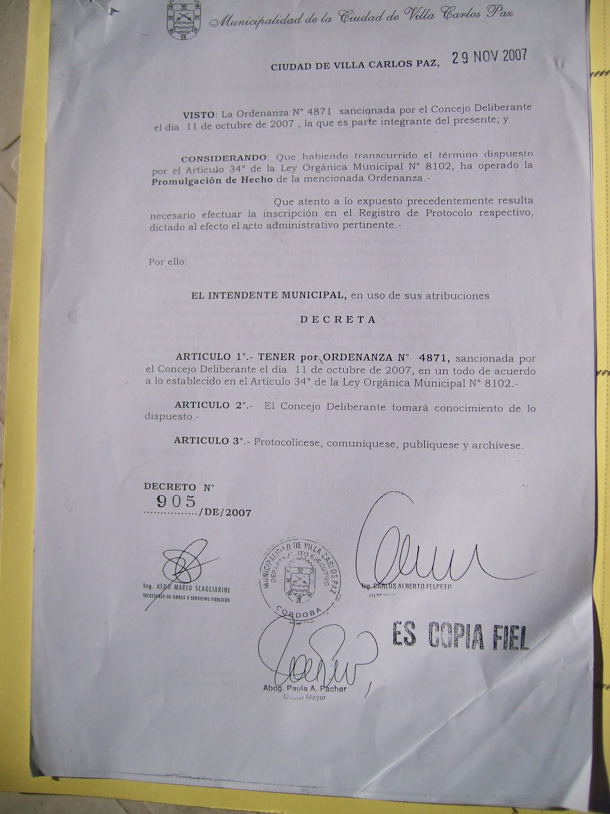 2)El cumplimiento, o no, de la Ordenanza Nº 4871/07 por parte del Municipio de Villa Carlos Paz, a tenor de su articulado.